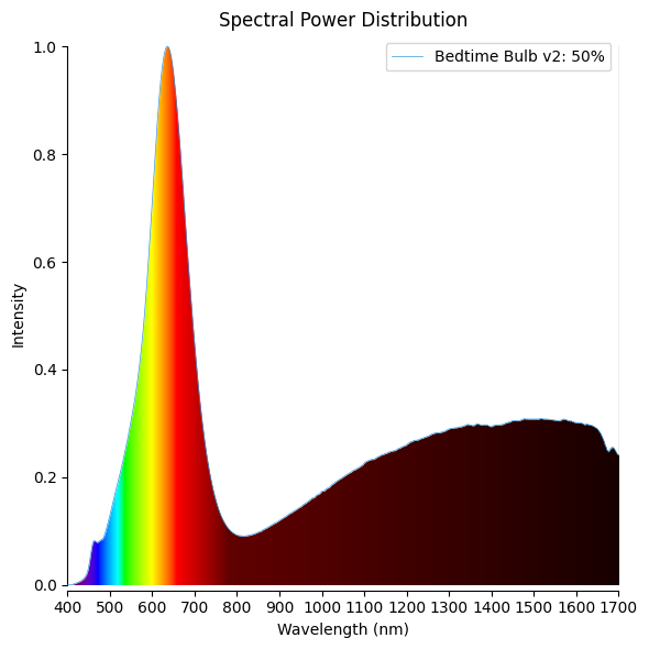 Without any dimming, Bedtime Bulb v2 significantly reduces sleep-disrupting blue light compared to LED and incandescent bulbs. At the same time, it emits abundant red and infrared light, which may support cellular repair and overall recovery.